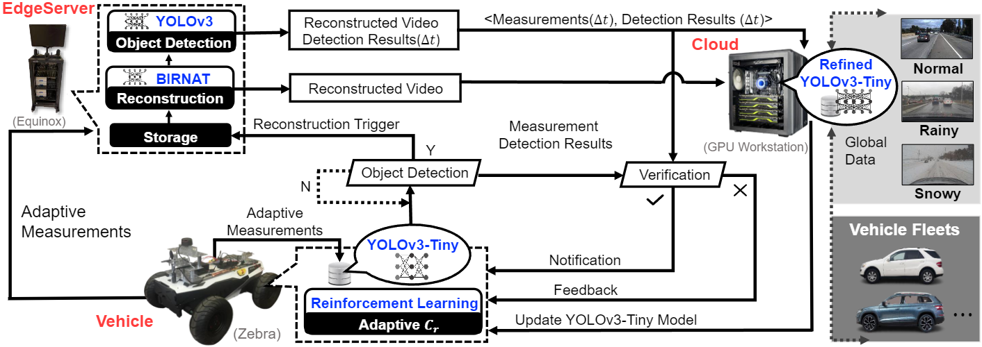 The complete VEC closed-loop framework to integrate TCS, edge computing, and CVs. The vehicle generates (captures) adaptive measurements based on the RL, which decides adaptive $Cr$ by involving vehicle tracking or measurement similarity analysis, and then a lightweight model (YOLOv3-Tiny) is employed to perform real-time detection based on raw measurements of vehicles. Compressed with low bandwidth measurements are also sent to the EdgeServer to save the information. When the trigger is on, the reconstruction operation is performed by BIRNAT, and a more accurate result of object detection based on the reconstructed video is described by an advanced detection network (YOLOv3), verifying the YOLOv3-Tiny's result. Meanwhile, these results will be sent to the cloud with the saved measurements to refine YOLOv3-Tiny to provide more accurate in-vehicle services. The reconstructed video will also be sent to the cloud to receive related information from vehicle fleets to conduct decision-making such as traffic control and path planning.